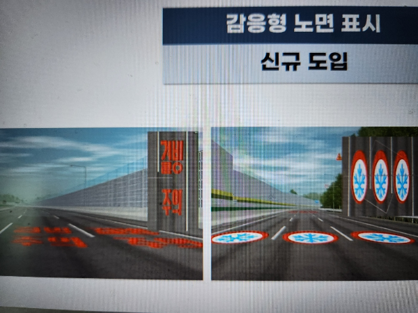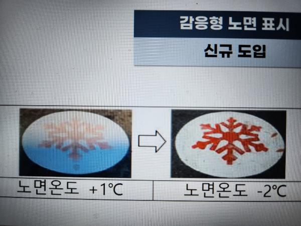 운전자가 결빙 위험을 시각적으로 인식하기 쉽도록 결빙 가능성이 높은 기상조건이 충족될 경우 색상이나 문양이 변하는 감응형 노면표시를 도입한다.